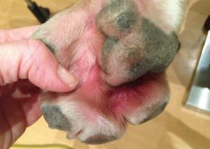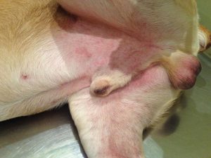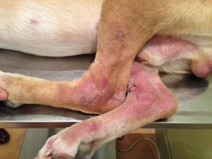 Dermatological examination showed an extensive papular reaction with marked erythema of all extremities, more intense on distal areas to the elbow and inter-pad and inter-digital areas. There was partial June 2020 alopecia and foci of exudation with scabs. The extremities were slightly edematous. On the abdomen and in the pinna, there was a diffuse erythematous micro-papular rash.