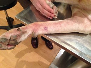 Hass, an 18-month-old male, mixed-breed dog weighing 42 kg, was presented with a six-month history of a rash on his legs and ears. The condition did not bother him but was not improving. The animal was happy and active. He had been treated with corticosteroids showing slight improvement during the treatments. He was off from medication for a month, and the condition was spreading. A fortnight ago, he received an injection of Ivermectin. He lived in a house with a garden with two other dogs without lesions and had no ectoparasite protection (Fig. 1).