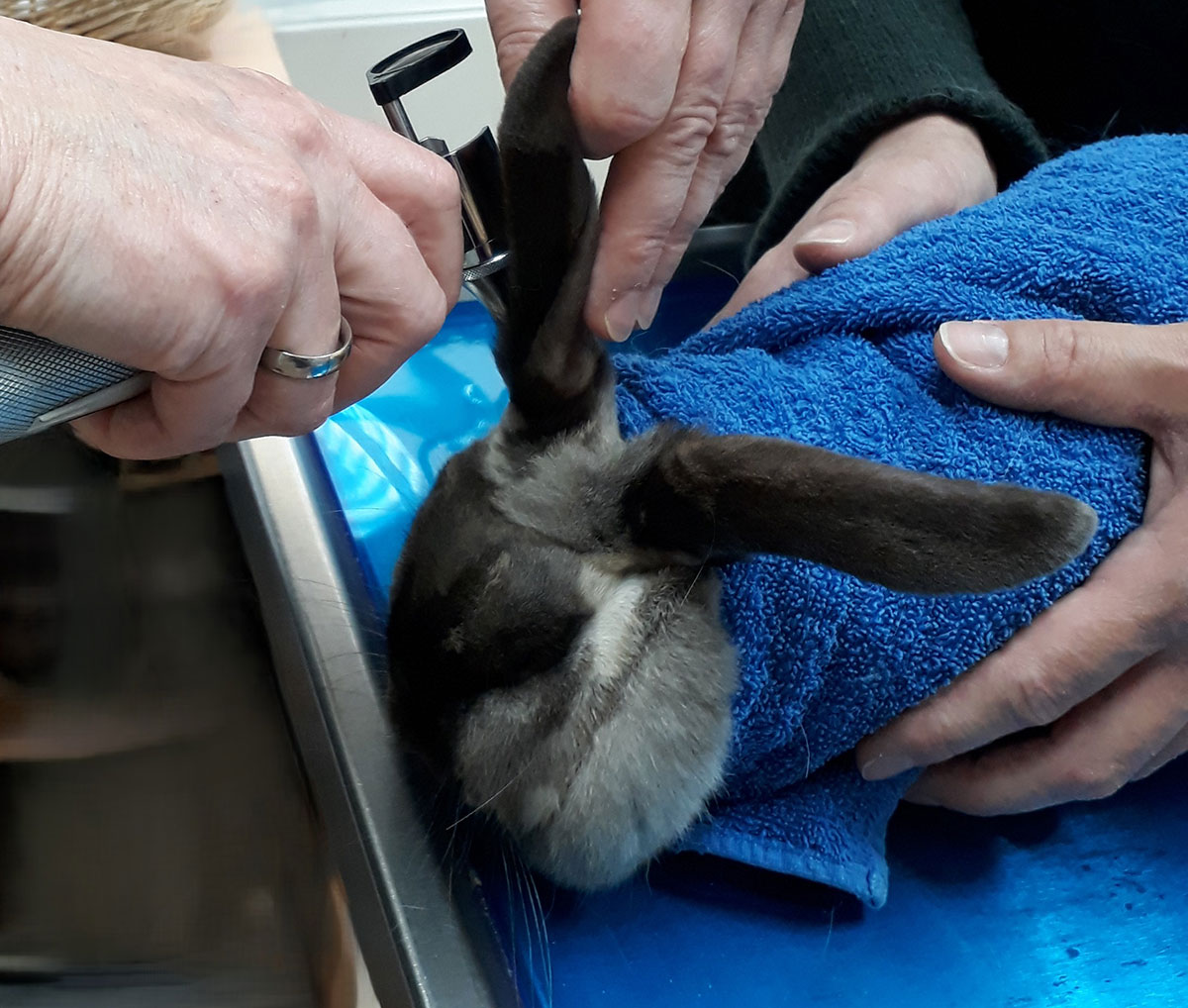 Fig. 1: Esame del condotto uditivo esterno nei conigli mediante otoscopio