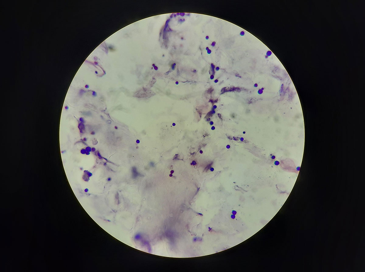 La citologia fornisce informazioni importanti sulla composizione della secrezione (cerume o pus) e sulle possibili cause primarie, come ectoparassiti, lieviti e/o aumento della conta batterica. Per la preparazione citologica, il tampone viene steso sottilmente su due vetrini. Un vetrino viene asciugato all’aria ed esaminato per la presenza di ectoparassiti utilizzando un microscopio ottico (condensatore rivolto verso il basso, diaframma chiuso, ingrandimento 100-400x). Il secondo vetrino viene colorato, ad esempio, con DiffQuick® e, dopo l’asciugatura all’aria, anch’esso esaminato (100-400x, 1000x con olio, condensatore rivolto verso l’alto, diaframma aperto).