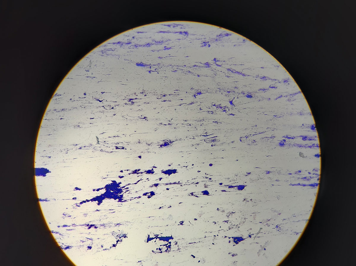 Fig. 6: Immagine microscopica di cerume nell’orecchio di un coniglio. Il cerume assorbe a malapena il colorante (ingrandimento 100x,
