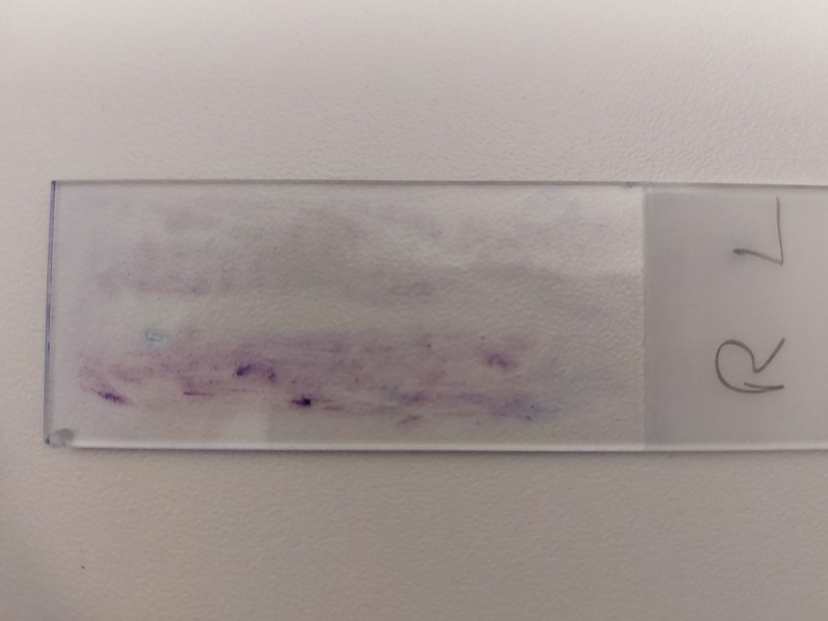 Fig. 5: Vetrino colorato con Diff-Quick® con strisci da tamponi prelevati dalle orecchie destra (R) e sinistra (L) di un coniglio