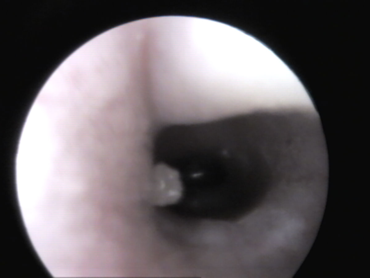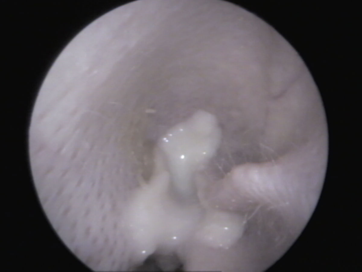 In un orecchio sano, tirando delicatamente il padiglione auricolare verso l’alto (Fig. 1), si riesce solitamente a vedere fino al timpano (Fig. 3). Se è presente materiale nel condotto uditivo, è importante distinguere se si tratta “solo” di cerume accumulato (bianco in profondità, giallastro verso l’orifizio) e il condotto uditivo è altrimenti normale, oppure se sono presenti segni di infiammazione (arrossamento, gonfiore, lesioni, liquefazione del secreto) (Fig. 4) e possibili cause primarie come corpi estranei e/o ectoparassiti.